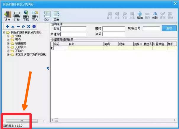 1、登录开票软件,点击【帮助】--【关于】模块,查看左下角版本号,最新版本号为V2.0.12 20161225 2、点击【系统设置】-【商品编码】-【商品和税收服务分类编码】,查看左下角税收分类编码版本号是否为最新的12.0