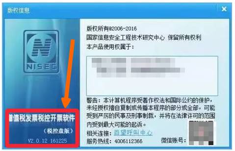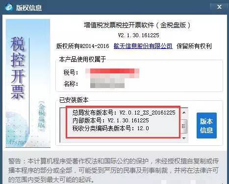 登入增值税发票税控开票软件(金税盘版)后,点击最上方的“帮助”-“关于”,会显示如下图的版权信息,如您的开票系统显示V2.1.30.161225 ,同时税收分类编码表版本号为12.0,即为最新版本。